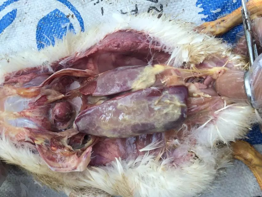 第四阶段:如上诉症状,治疗不及时未治愈,出现大肠杆菌、浆膜炎的继发感染,引发败血症,出现心包炎、肝周炎的情况,鸭群出现伤亡,减料情况。治疗以解热+控制败血症(选择内服吸收好的抗菌药物)为主。