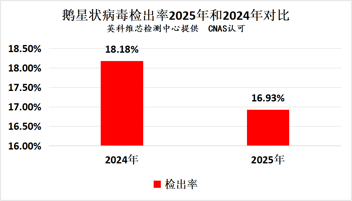 5.鹅腺病毒2025年检出率相比2024年明显增高,需要引起大家高度重视。鹅腺病毒主要危害3-30日龄雏鹅,夏季高发,常会造成鹅非常高的致死率(25%-75%)。解剖主要表现心包积液、肝脏肿大。一旦发病可选用疫维康治疗,可取得良好的效果。