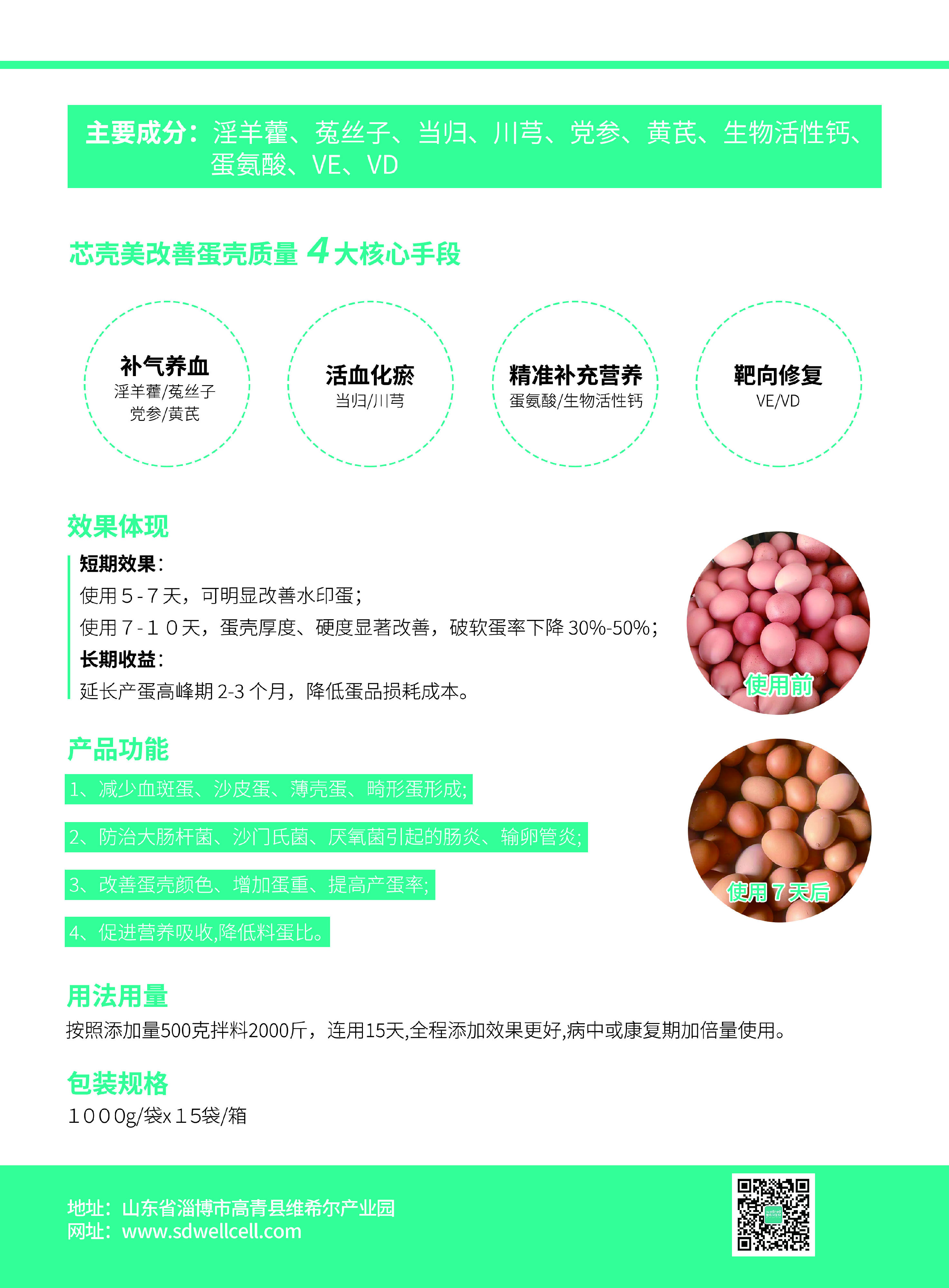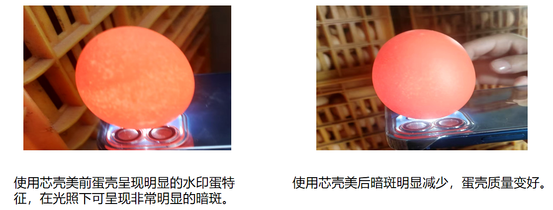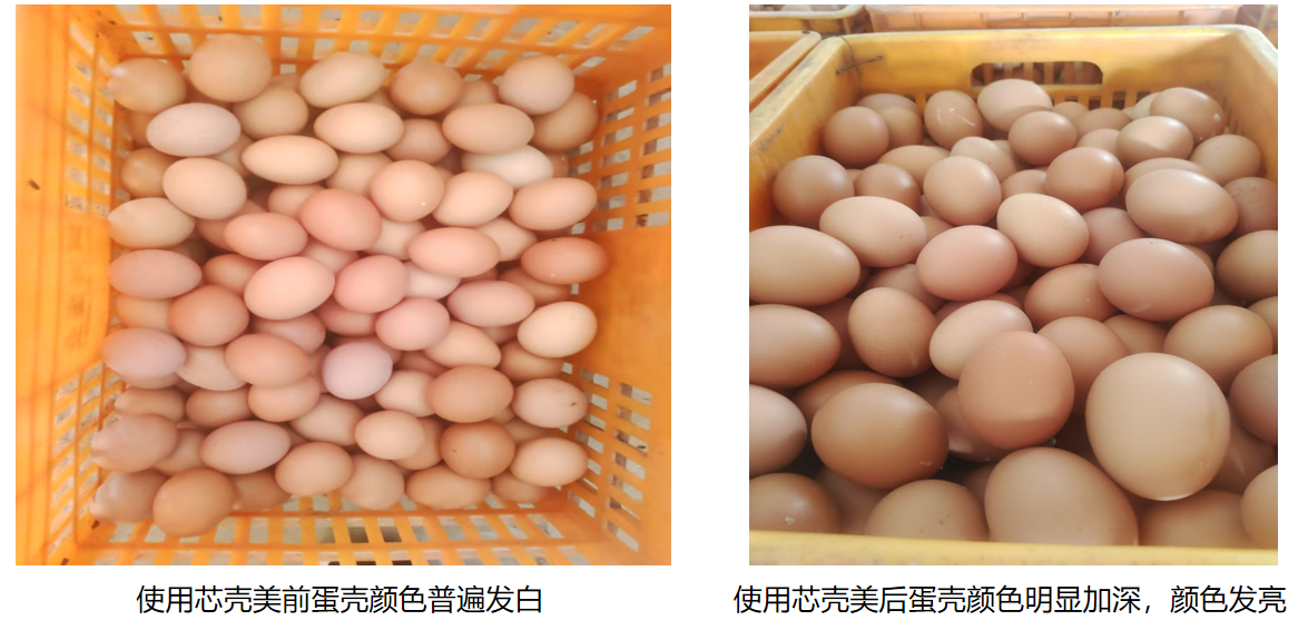 临床应用实践表明,通过给产蛋鸡拌料使用产品芯壳美,可在短时间内快速改善蛋壳质量,并具有促进卵泡发育、提升产蛋率的作用。