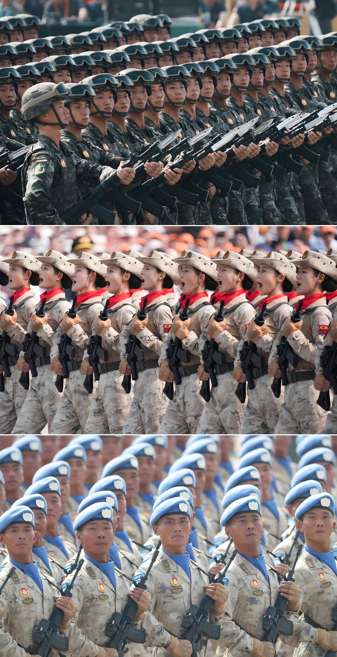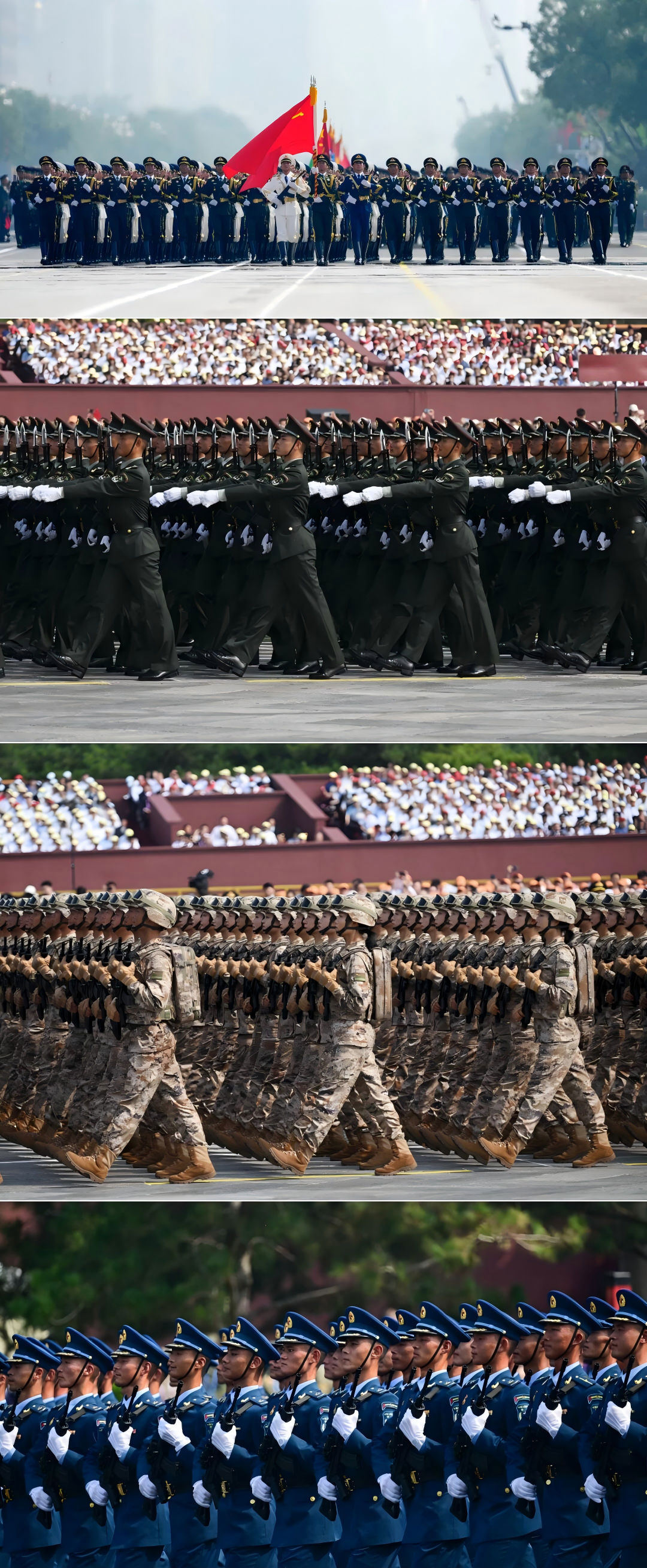 九三阅兵是一场穿越历史烽烟的检阅。空中护旗梯队旌旗永擎、徒步方队步履铿锵、战旗方队荣光不朽、装备方队铁流霹雳、空中梯队制胜空天……一场方阵整齐、装备精良、技术先进、锐不可当的阅兵盛宴,充分彰显了我国当今大国强军风采。